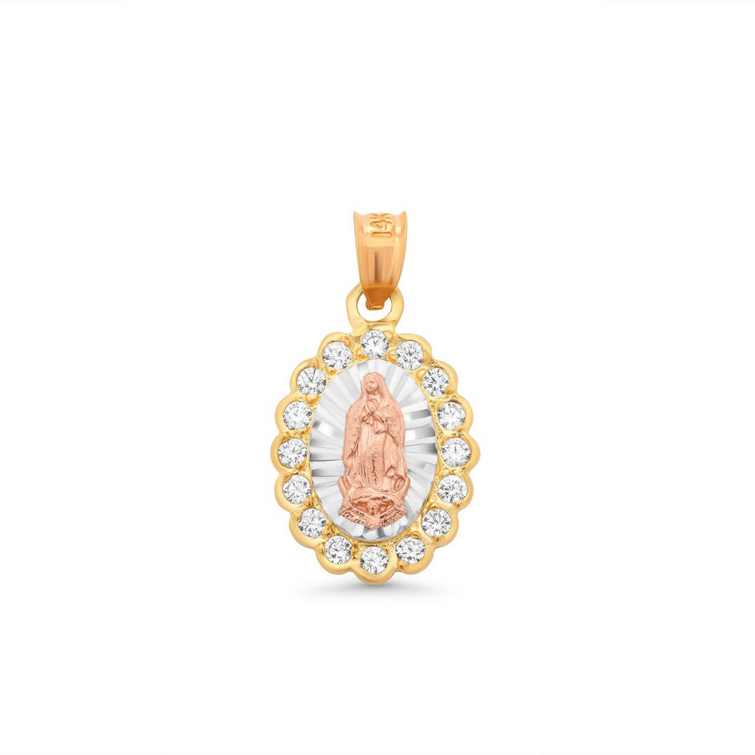 14K Tri Color Gold Virgin Mary Pendant – Oval Medallion with Cubic Zirconia Stones