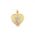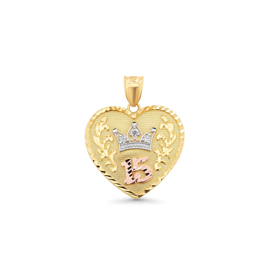 This Tri Color yellow gold “15” heart pendant is a stunning piece designed to commemorate a very special milestone. Crafted in a classic heart shape, the pendant features a tri-color gold crown accented with sparkling cubic zirconia stones, symbolizing beauty, strength, and royalty. The “15” adds a warm, elegant contrast against the rich yellow gold background.