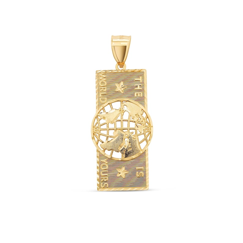 Make a bold statement with this 14K Yellow Solid Gold “The World Is Yours” Pendant, a powerful symbol of ambition, purpose, and success. Crafted with remarkable detail, the pendant features a globe design framed by a textured rectangular backdrop, complete with raised lettering and star accents that bring depth and dimension to the piece.